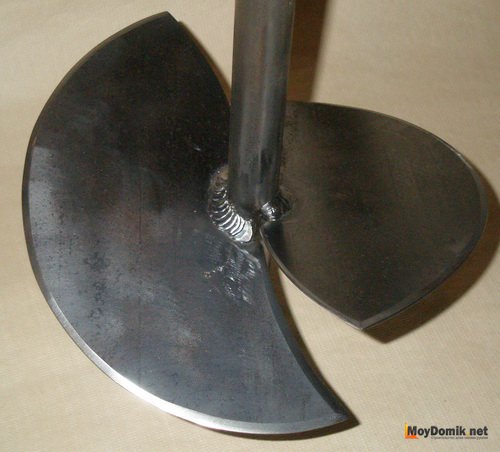 - Для того, чтобы закрепить лезвия, нужно просверлить в них отверстия (в центре), посредством которых лезвие будет крепится к стойке. Диаметр отверстий следует делать небольшим, примерно на 1 миллиметр больше, чем у стойки бура.