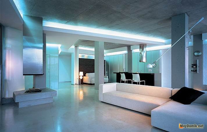 Каскад галогенных лампочек, led светильники, лед ленты, световые шторы на бескрайних окнах, верхняя, нижняя и боковая подсветка – помогают визуально разделить пространство на дополнительные зоны и добавить дизайну футуристичности.