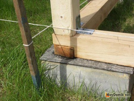 Закрепив стойки можно начинать возводить основание каркаса, для наших целей идеально подойдут следующие материалы: брусья, бревна или кирпич.