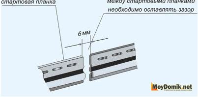 Между двумя стартовыми планками, расположенными по соседству всегда должен присутствовать зазор 5-7 мм.