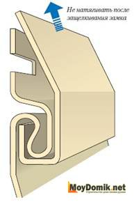 3.2. Панель сайдинга нужно опустить к начальной планке и защелкнуть. Для этого нужно чтобы замок полосы зацепился за стартовую планку. Ни в коем случае не «вытягивайте» панель. Поскольку в этом случае вытянется радиус панели и будут деформированы замки. Как установить сайдинг панель правильно – смотрите на рисунке.