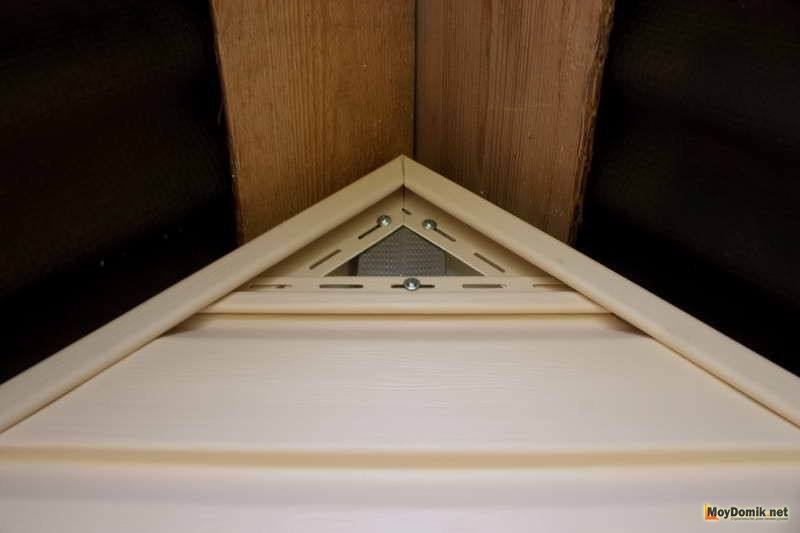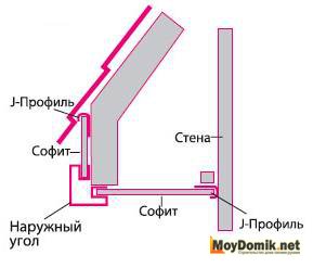 При этом наружный угол крепится на ребре лобовой доски, а J-профиль по обе стороны от него на необходимом расстоянии. Вырезается софит нужного размера и заводится между одной из частей угла и J-планкой.