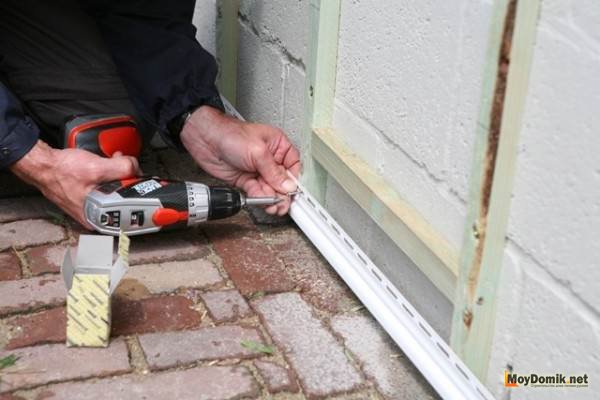 3.1. Первая полоса сайдинга вставляется в вертикальные пазы углового или Н-образного профиля и закрепляется саморезом точно по центру гвоздевых отверстий.