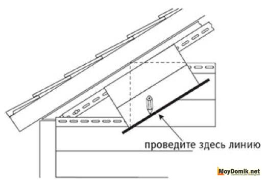 Сделать это можно с помощью нехитрого приема: положить кусок полосы материла к поверхности фронтона, а целую панель в уровень с J-профилем.