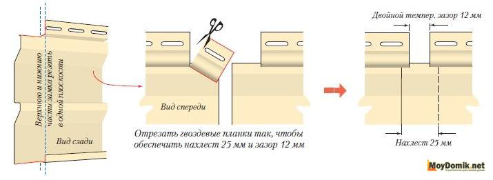 Монтаж сайдинга вокруг выступающих предметов происходит посредством разрезания полосы и ее крепления внахлест.