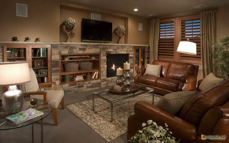 Гармонично вписываются в деревянный интерьер балки, надежно поддерживающие крышу, и всевозможные конструкции проемов и арок. Респектабельно на фоне дерева смотрятся природные камни или материалы, искусно имитирующие их. Такой вид отделки хорош не только в плане эстетики, но и практичности – изделия из камня прослужат не один десяток лет.