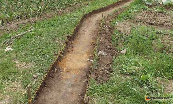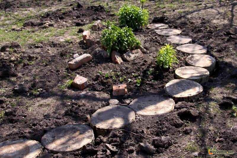 Для этого по размеченному маршруту будущей тропинки нужно прокопать траншею. Ее глубина зависит от длины пенька (спила) плюс 50-100 мм. (зависит от типа грунта и предполагаемой нагрузки на дорожку).