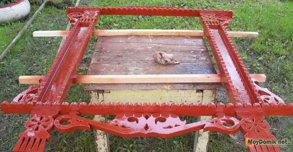 Детали, выполненные накладной резьбой крепятся к широкому основанию наличника на гвозди. Желательно, чтобы гвозди были без шляпок. Более надежное соединение можно обеспечить, если нанести клей на узор с изнаночной стороны. Мастера советуют не применять саморезы для соединения, чтобы не повредить место соединения.