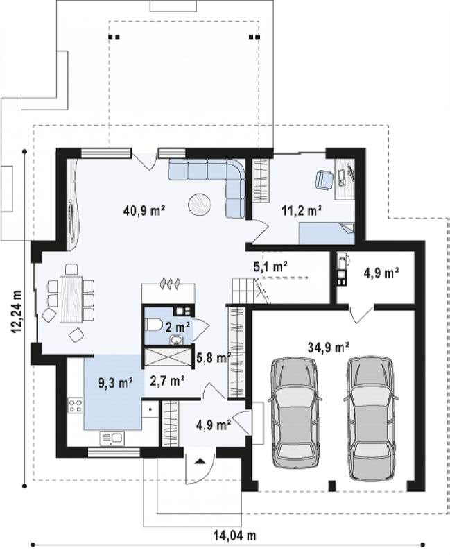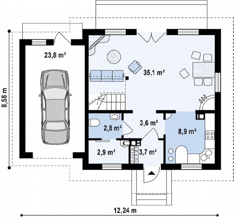 Нижний этаж можно перепланировать таким образом, чтобы на одном фундаменте с домом разместить еще и гараж для автомобиля, а то и для двух.