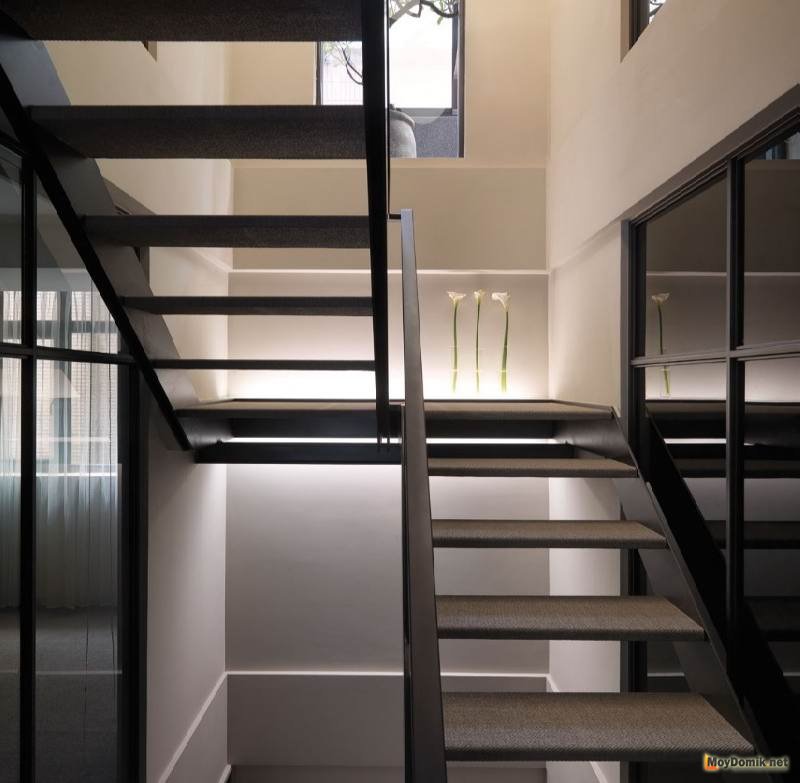 Лестница на металлических косоурах позволяет создать легкие и невесомые конструкции. Особенно эффектно они смотрятся в помещениях с отделкой в стиле хай-тек или модерн.