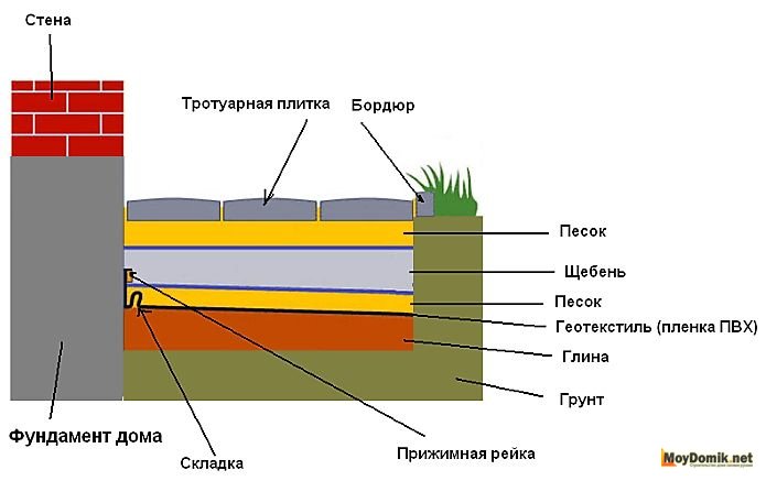 Поскольку отмостка тротуарной плиткой относится к отмостке мягкого типа, при ее обустройстве нужна качественная подложка. Она представляет собой своего рода слоеный пирог, конструкция которого показана на рисунке. Следует отметить, что в целях экономии и с учетом типа грунта можно варьировать толщину слоя, но исключать какой-либо из пластов не рекомендуется.
