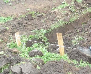 На углах образованного ложа устанавливаются колышки. Между ними натягивается веревка. Ее назначение служить ориентиром в работе. Поэтому следует заранее проверить уровнем правильность ее натяжения.