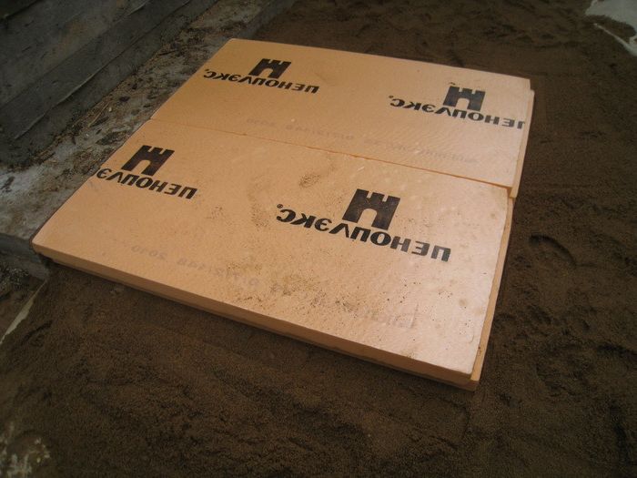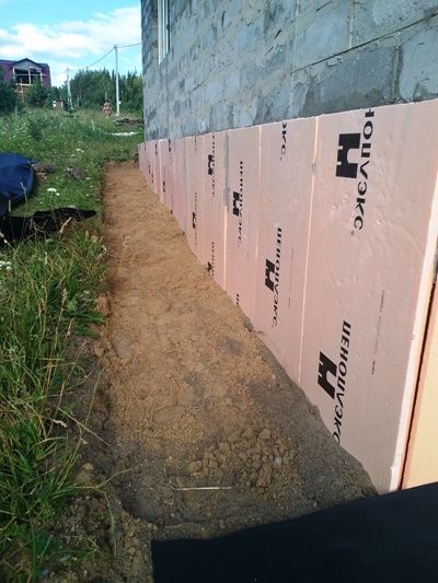 - установка пенополистирола (или пеноплекса) на поверхность фундамента (цоколя дома), он будет выполнять функцию утеплителя и компенсационного зазора между фундаментом и бетоным основанием;