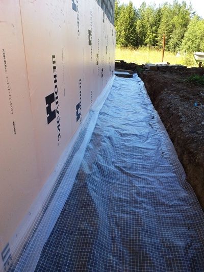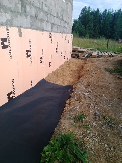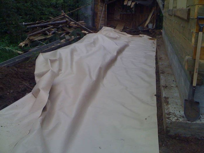 В качестве гидрозамка может выступать геотекстиль, рубероид, пленка ПВХ, или старый рекламный баннер. Укладывая пленку, не следует натягивать ее. А возле фундамента вообще нужно создать складку. Такой подход обеспечит движение пленки под воздействием температурных колебаний грунта и гарантируется ее целостность в течении всего периода службы. Баннер или пленку нужно укладывать с нахлестом на фундамент. Чтобы исключить движение, верхний край пленки прижимают рейкой или уголком.