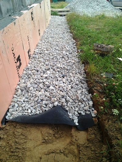 В случае, если планируется устройство ливневой системы, на конец пленки, противоположный от стены здания укладывается труба, которая засыпается щебнем. Он защищает трубу от забивания. Также устанавливается ливнеприемник и укладываются трубы ливневки.
