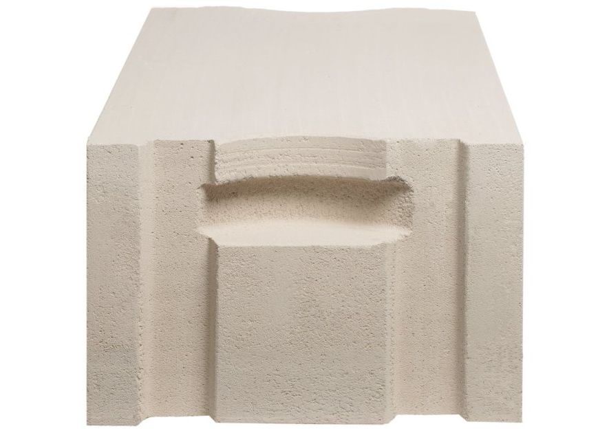 Абсолютно гладкий прямоугольный газоблок, имеющий выемки для захвата руками. Захват удобен в работе, поскольку позволяет легко перемещать блоки.