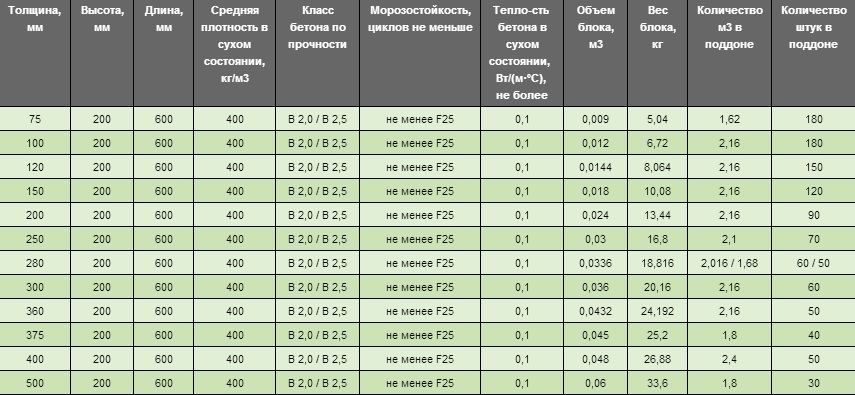 Параметры (размер, вес, объем, количество) газобетонных блоков D400