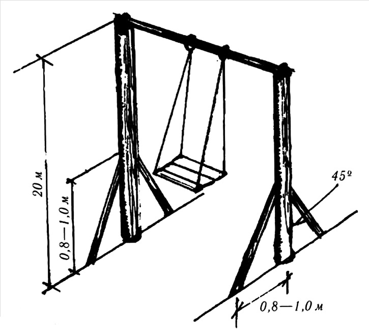 П-образный каркас. Обустройство начинается с того, что скрепляются вертикальные стойки и верхняя перемычка. Затем нужно вырыть два углубления (глубина составляет 1/3 от высоты опоры). Насыпать на дно щебнево-песчаную подушку, установить стойку, забетонировать, подождать пока застынет бетон, и установить подвес с сидением.