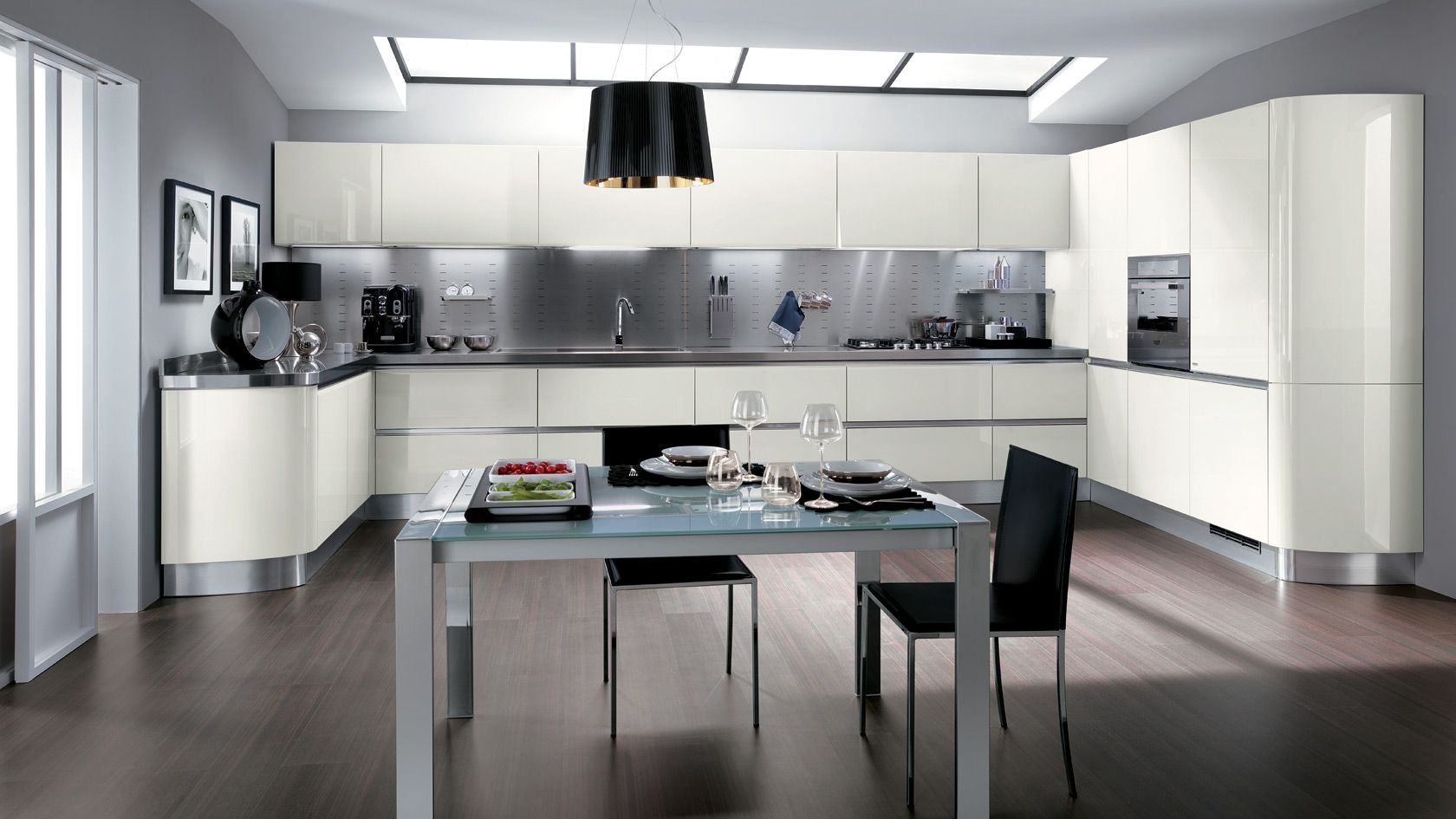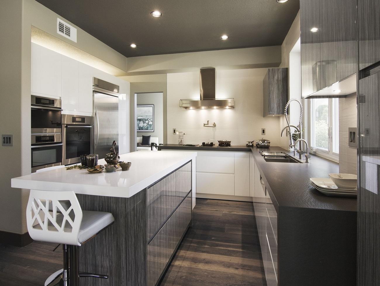 Цель такого проекта – создание жилого кухонного пространства, в котором хозяин (ка) студии (используя достойное лучших ресторанов оборудование) легко примерит на себя роль знаменитого повара. Особенность студий стиля хай-тек – комбинация стальных, стеклянных и деревянных фасадов.