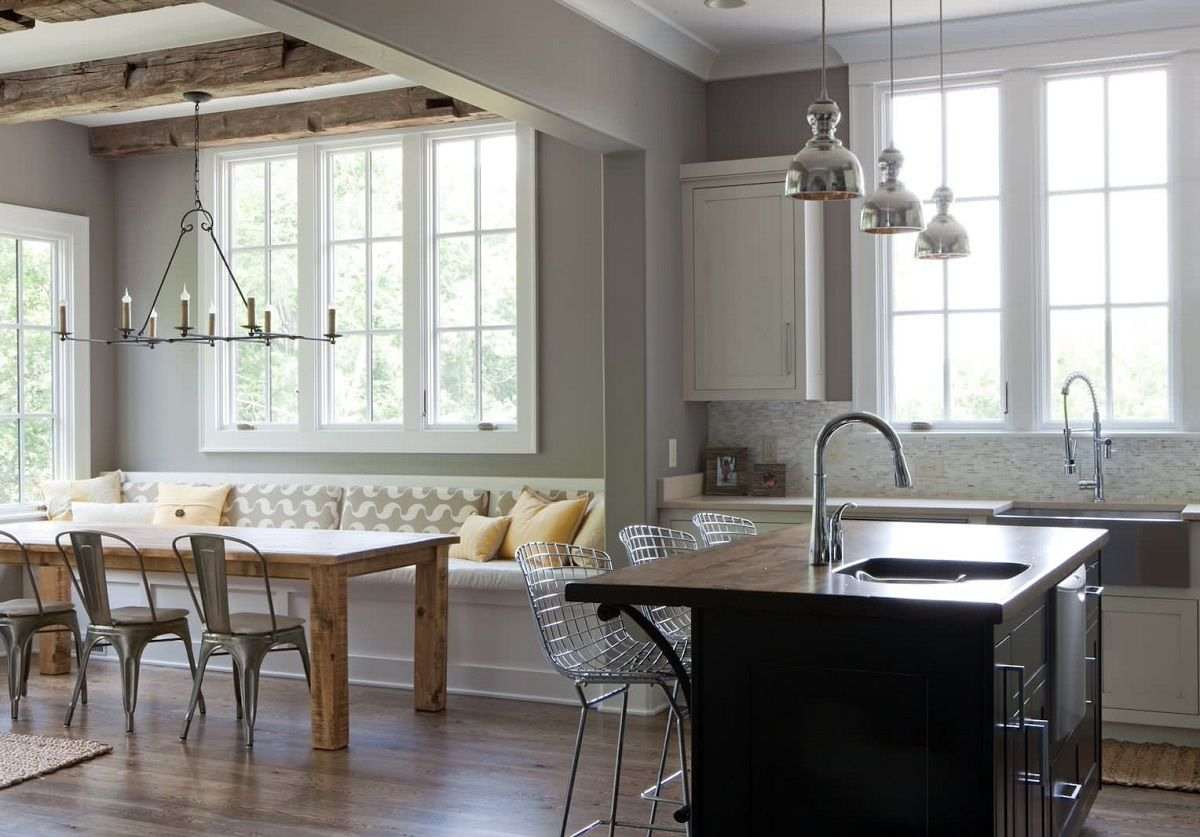 Особенность дизайна кухни с окнами разных размеров на одной стене в том, что он изначально предполагает деление пространства на зоны. Такому помещению подойдет все, что уютно: скандинавский стиль, шале, европейская классика, кантри, но все в современном прочтении.
