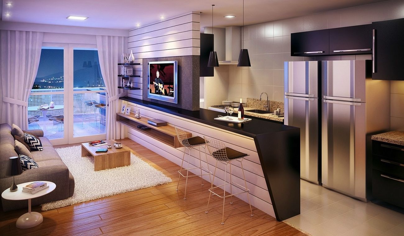 Обстановка в квартире-студии с большим окном довольно аскетичная: удобный диван, компактный столик и дизайнерская барная стойка, которая разделяет кухню с гостиной и одновременно служит обеденным столом. Чтобы готовить было максимально удобно, за стеной с телевизором установлена дополнительная столешница.