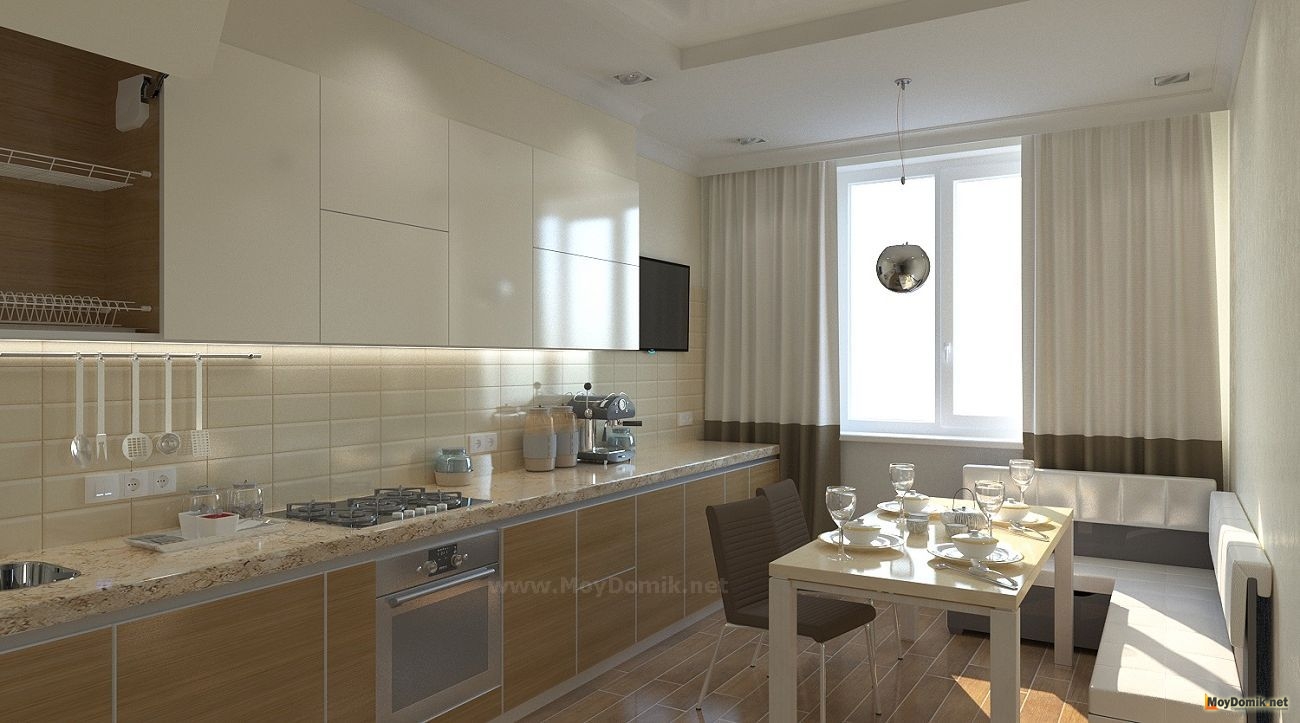 - Гарнитур под окнами задействовать по максимуму, расположив в нем обязательную бытовую технику и зоны хранения.