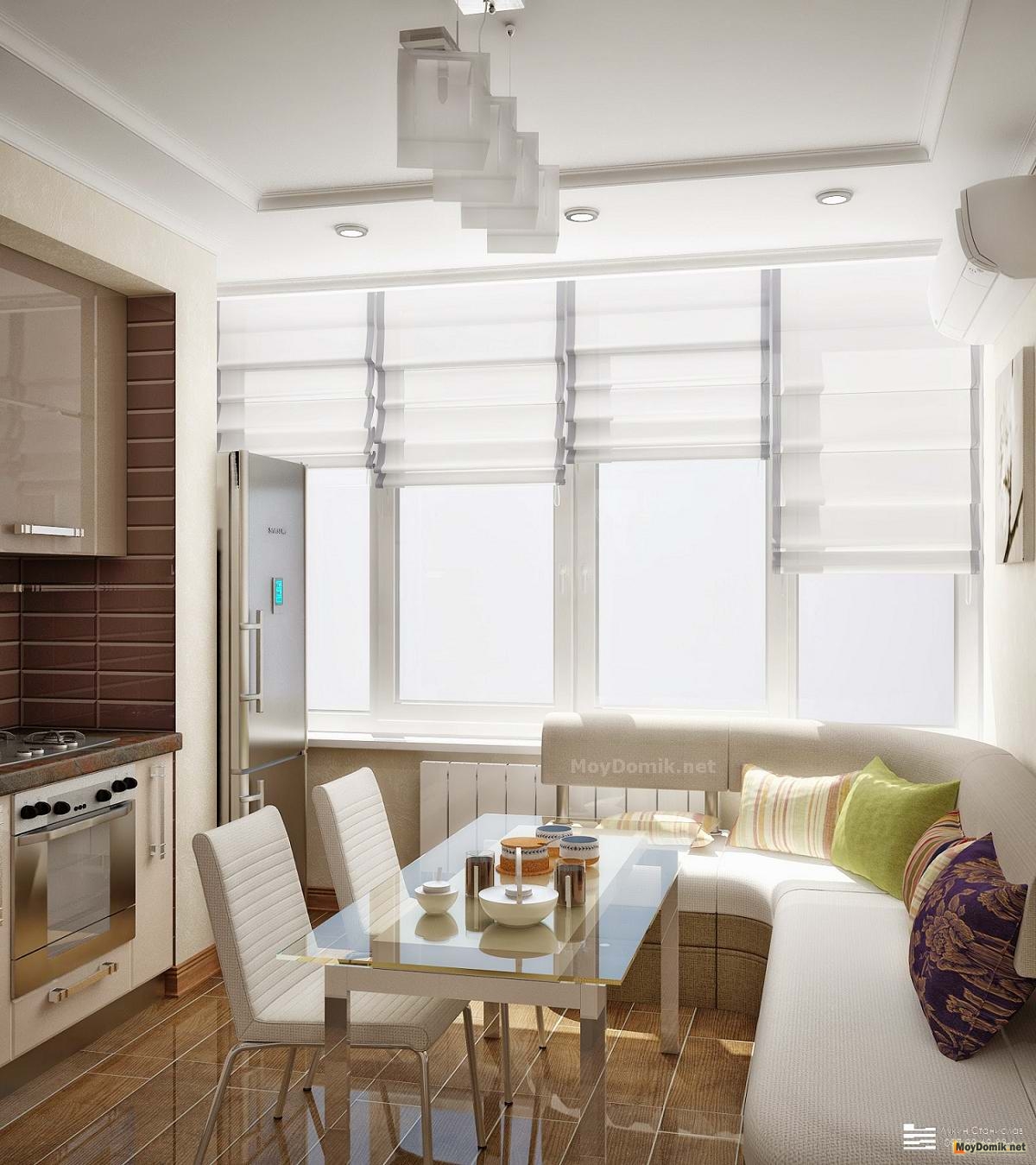 На фото современный интерьер кухни с большим окном от архитектора Станислава Лукина. Установка скругленного углового дивана в разы повысила уровень комфорта кухни. В модели данного дивана предусмотрены системы хранения в нижней части. Стеклянная поверхность стола при необходимости раскладывается.