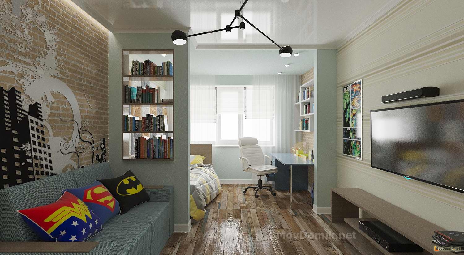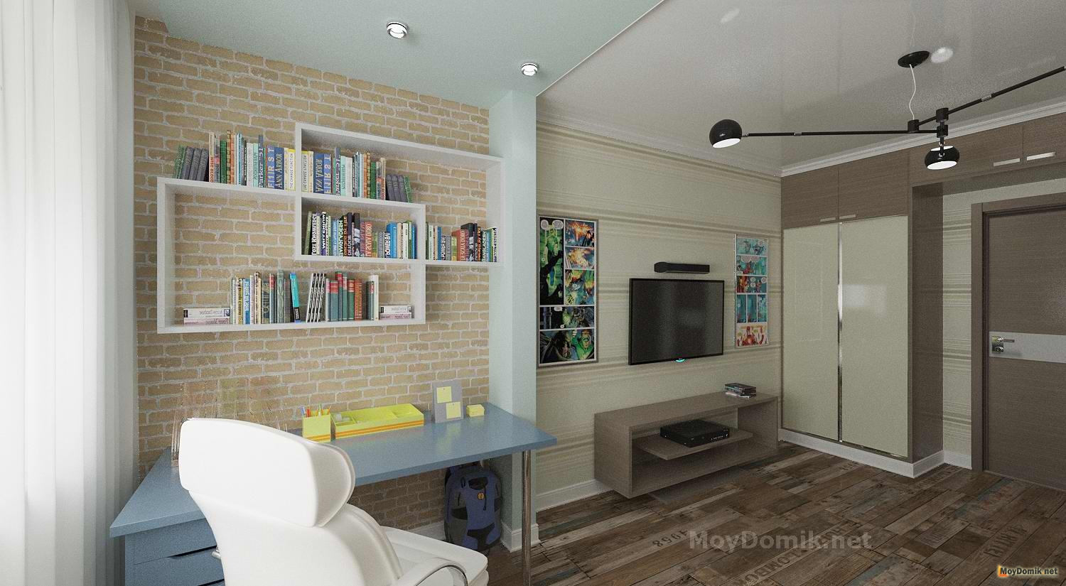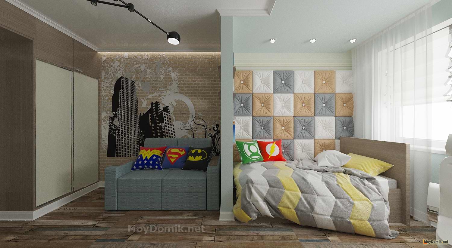 Еще одна интересная идея архитектора Стаса Лукина – детская в современном стиле. Интерьер получился динамичным и ярким, а грамотное зонирование позволило объединить в одной комнате важные пространства.