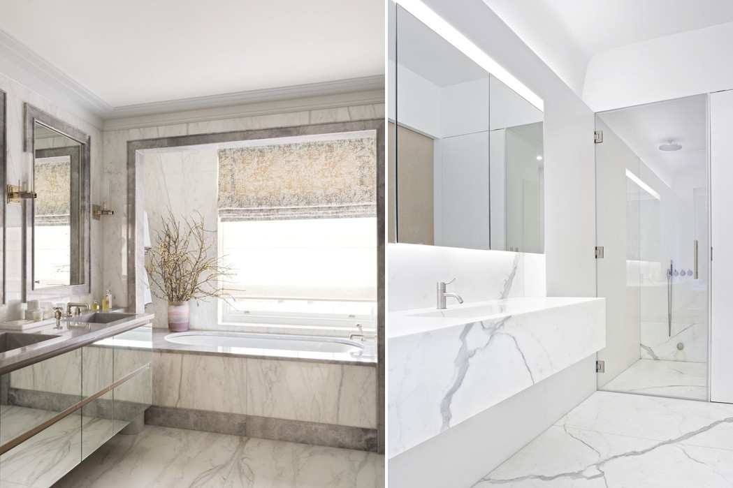 В числе фаворитов современности и ванные с мраморной поверхностью. Не обязательно «одевать» комнату в натуральный камень с ног до головы. Модные дизайнеры предлагают компромиссное решение – сочетать мрамор с нержавеющей сталью. Пример на картинке.