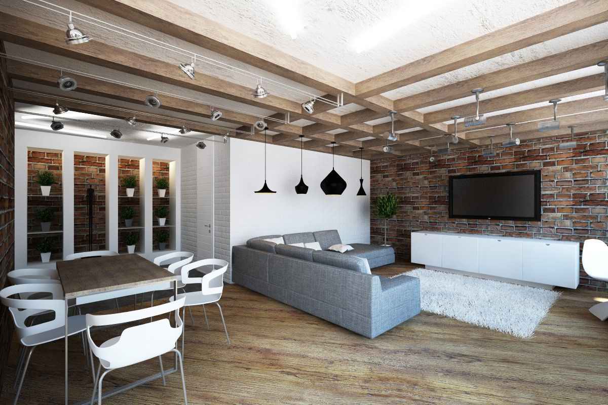 Для создания фактурного акцента на стенах, в гостиной зоне часто используют декоративную штукатурку, деревянные панели, 3D панели или кирпич. Остальные поверхности оставляют светлыми, нейтральными по цвету.