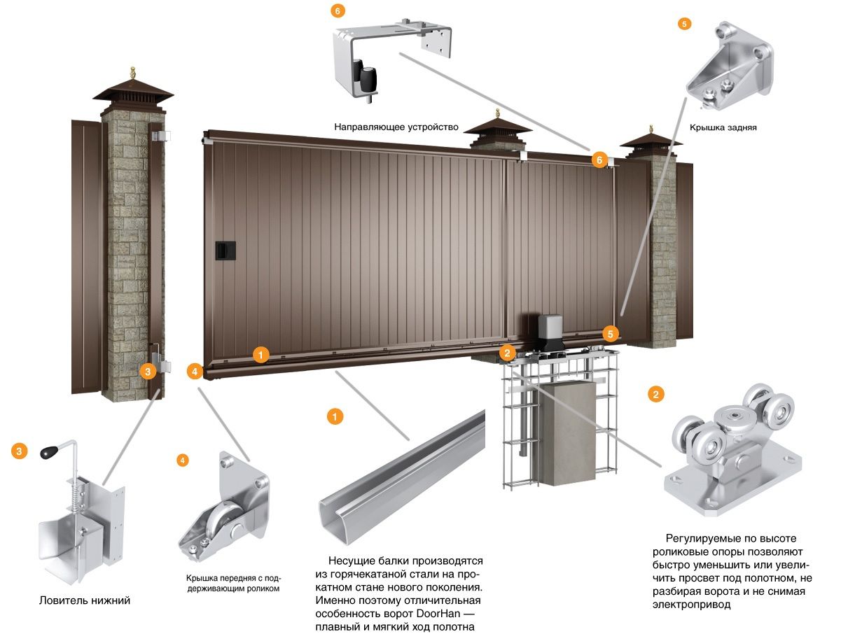 Отдельно остановимся на том, какие элементы включает в себя механизм откатных ворот. В общем виде – это фурнитура и автоматика.