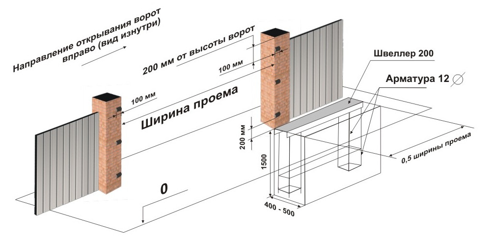 - выкопать траншею. Глубина и ширина 500 мм, длина углубления равна ½ ширине проема ворот. Для створки шириной в 4 м.п. нужна траншея 2 метра длиной;