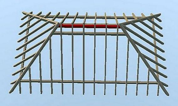коньковая опорная балка или коньковый брус – используется для классической вальмовой крыши, выполняет функцию несущего элемента, к которому крепятся диагональные стропила;