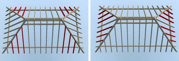 - увеличение прочности диагонального стропила вальмовой крыши за счет удвоенного сечения;