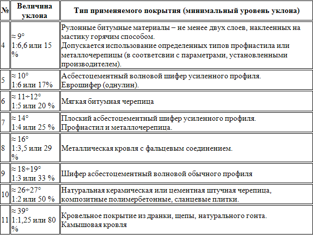 Расчет кровельного материала выполняется по формулам с учетом угла наклона крыши. Оптимальный уклон крыши для кровельных материалов разных видов приведен в таблице: