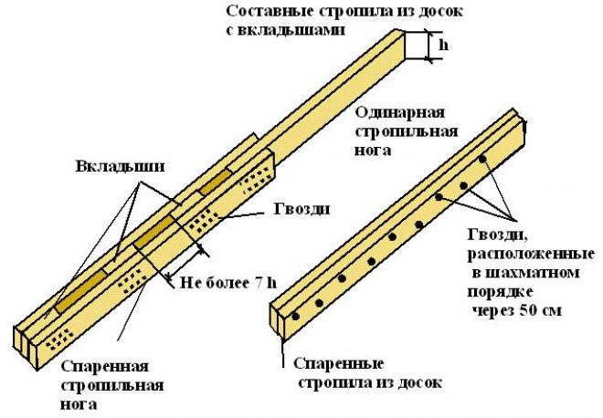 Нарожники изготавливают только из цельного пиломатериала. В месте примыкания нарожника к длинному стропилу делают врубки или устанавливают опорные балки. Место установки дополнительно усиливают металлическими элементами.