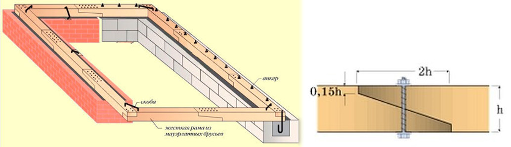 Примечание. Под мауэрлат в кирпичных домах (или из газобетона, пенобетона, арболита) заливают пояс из железобетона с заранее установленными шпильками для монтажа бруса. Шпилька имеет диаметр 10 мм и более и должна выступать за плоскость мауэрлата на 20-30 мм. Шаг установки шпилек – 1000-1200 мм.