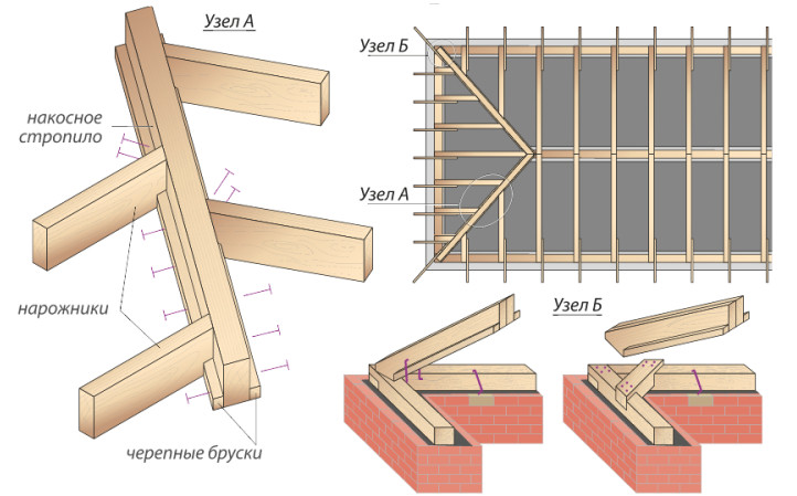- наличием диагональных стропил (накосных), которым уделяется особое внимание. За счет длины накосные стропила несут большую нагрузку, нежели основные стропила, и поэтому требуют применения более качественного пиломатериала с большим сечением. Кроме того, часто длина диагональных стропил превышает стандартную длину досок.