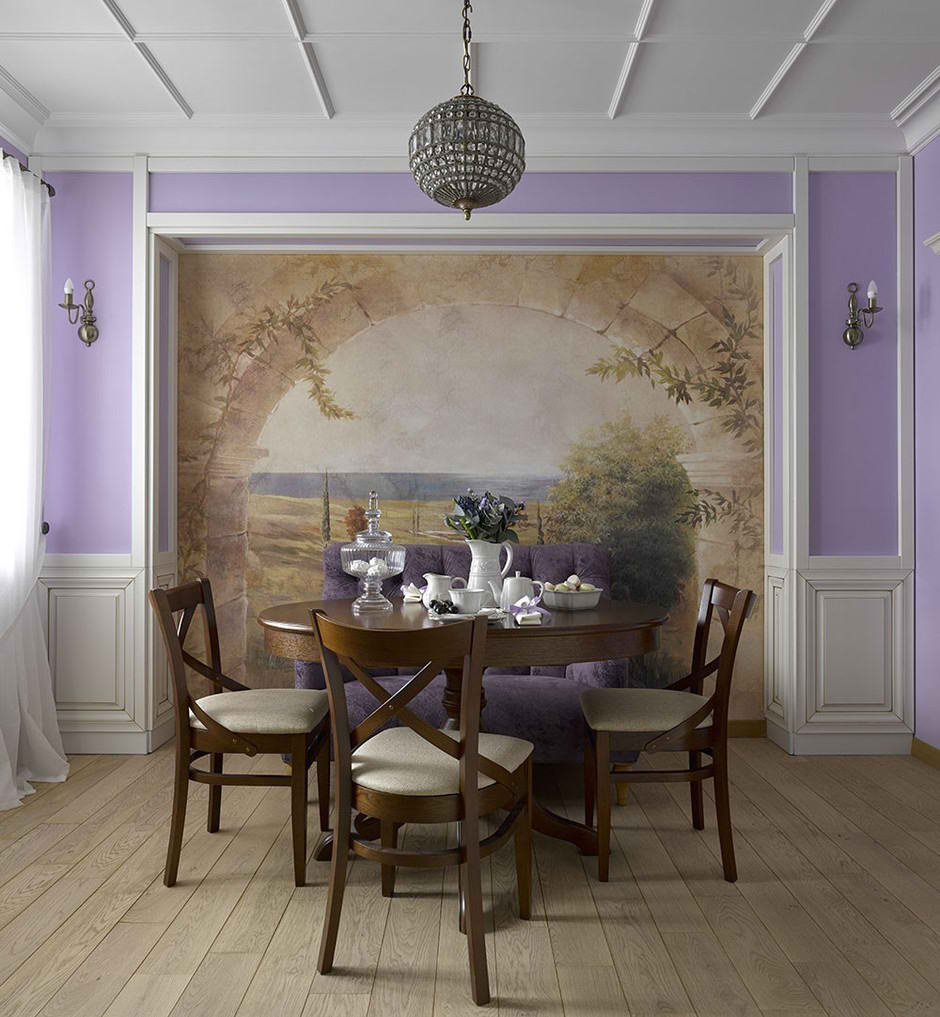В доме из оцилиндрованного бревна одну из межкомнатных стен легко превратить в художественное полотно. Для этого на перегородку из гипсокартона монтируют декоративное панно – необходимый атрибут дизайн интерьера во французском стиле Прованс. Рядом с панно можно разместить обеденный стол или обустроить зону отдыха с уютными креслами и напольным торшером.
