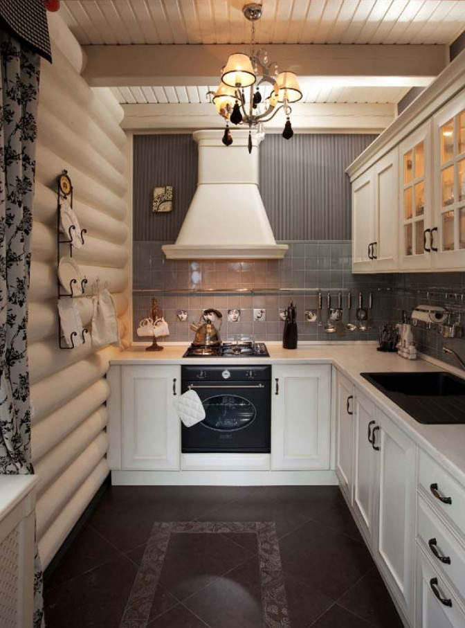 На фото кухня в деревянном доме с вытяжкой, напоминающей печную трубу.