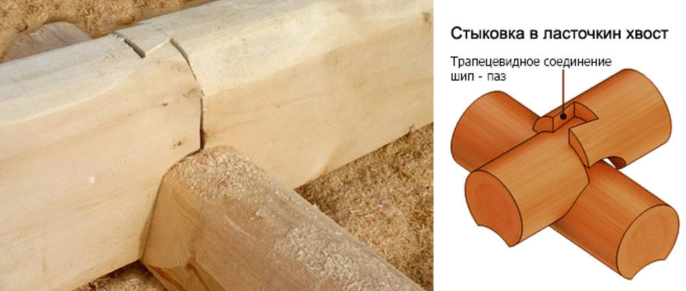 Для удлинения бревна используется соединение «ласточкин хвост», поскольку позволяет создать наиболее прочное и надежное соединение в стык.