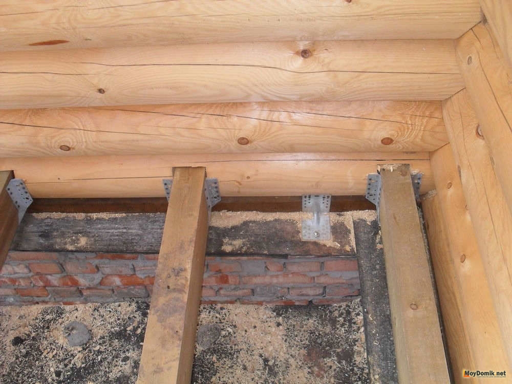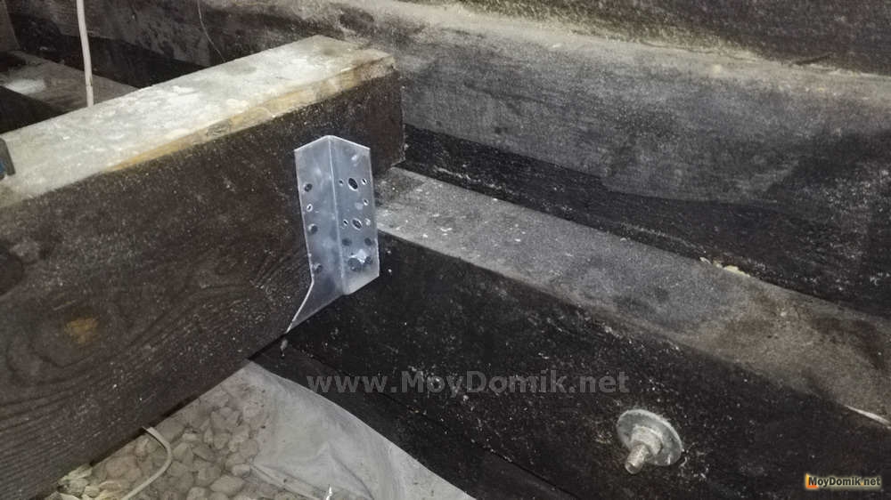 Лаги для пола опираются на брус, прикрепленную к фундаменту