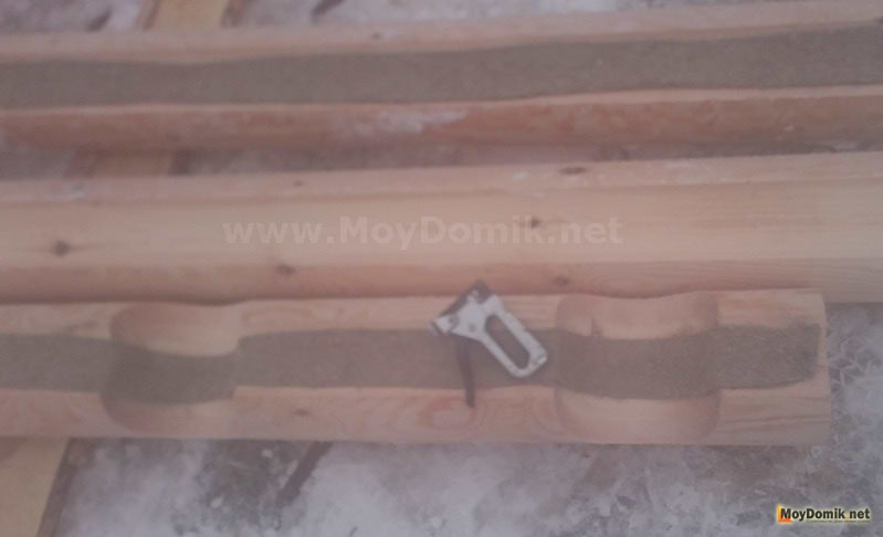 Укладка рулонного теплоизоляционного материала между венцами бревенчатой стены. Полотно утеплителя укладывается в один слой, для надежности крепится степлером. Ширина полотна на 10-20 меньше ширины продольного паза. Величина перехлеста – 50-70 мм. За метр до конца бревна (угол или проем) утеплитель укладывается в два слоя. Это обусловлено тем, что в проеме бревно высыхает более интенсивно. В чаши утеплитель также укладывается в два слоя;