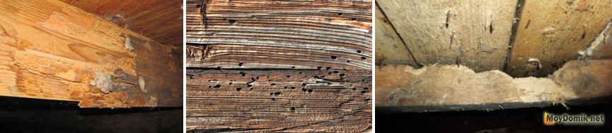- червоточины. Жизнедеятельность древесных жучков может существенно повредить балки перекрытия;