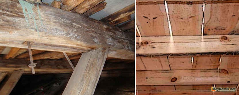 - гниение и повреждение плесенью. Особенно часто встречается на балках чердачного перекрытия. Плесень на потолочной балке появляется в следствие протекания крыши. Появление сгнивших участков распространено в месте врубки балки в стену. Причина – недостаточная гидроизоляция в этом месте;