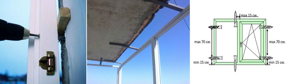 При остеклении балкона, а тем более балкона с выносом, рама фиксируется дюбелем через профиль. При этом размеры зазоров не должны превышать 30 мм. для боковых стоек и 20 мм. для нижнего и верхнего профиля рамы.