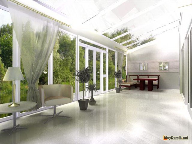 - Во-первых, благодаря стеклам в помещение свободно будет проходить солнечный свет, соответственно ваша веранда будет самым светлым помещением в доме. А если ее утеплить и провести отопление, можно использовать как зимний сад.