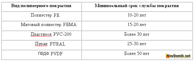 Срок службы покрытий представлен в таблице