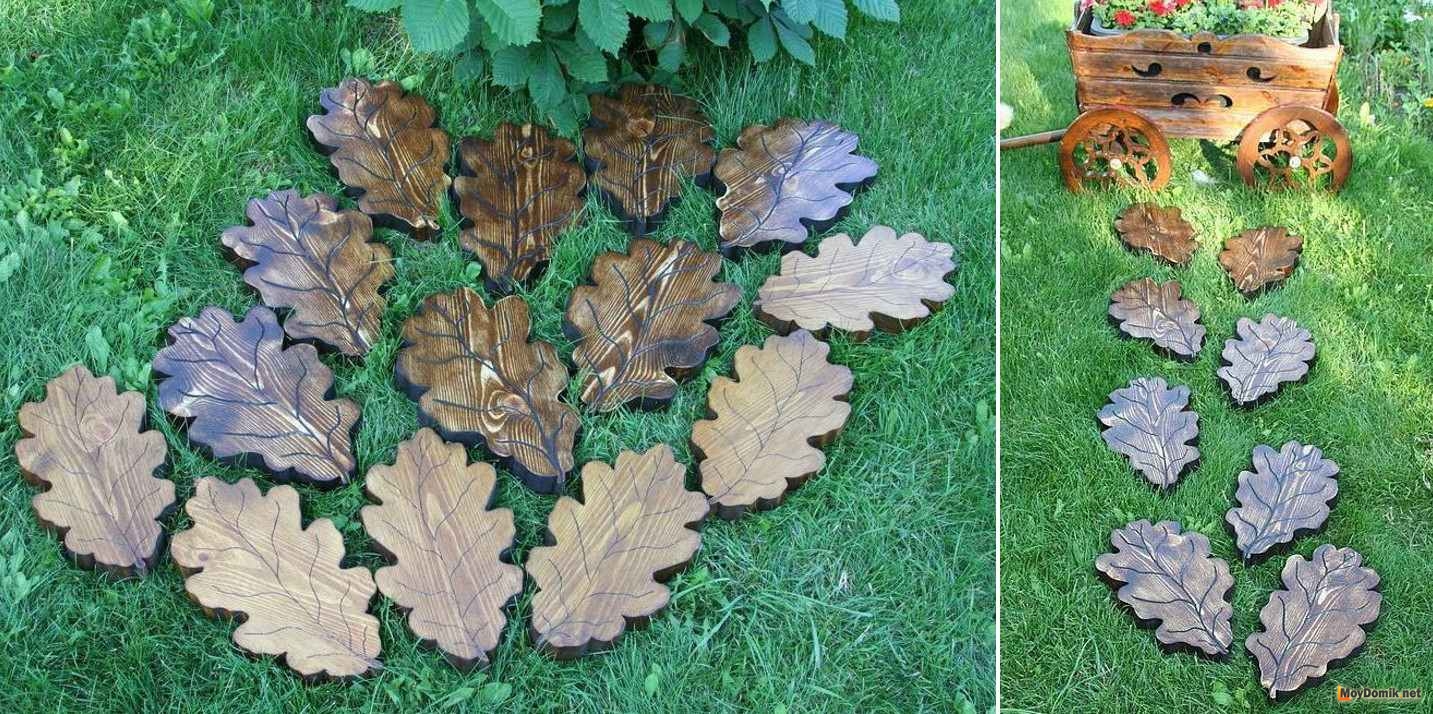 Деревянным заготовкам придается определенная форма. Но этот процесс достаточно трудоемкий, поэтому наименее распространен. Сложность зависит от выбранной формы, например, геометрические фигуры (ромб, круг, квадрат и прочие) можно сделать без спец оборудования, а вот что-то более изысканное (клиновый лист, абстрактные многоугольные фигуры) потребуют мастерства в столярных и плотницких работах и наличие элетролобзика. Принцип выкладывания такой дорожки схож с предыдущими.