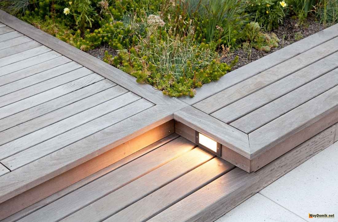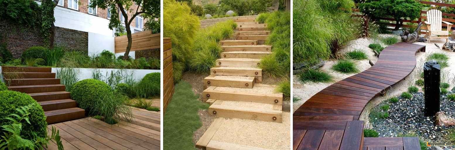 Кроме того, помимо одноуровневых садовых дорожек из дерева (расположенных в одной плоскости) возможно устройство многоуровневых (многоярусных) в виде ступенек.